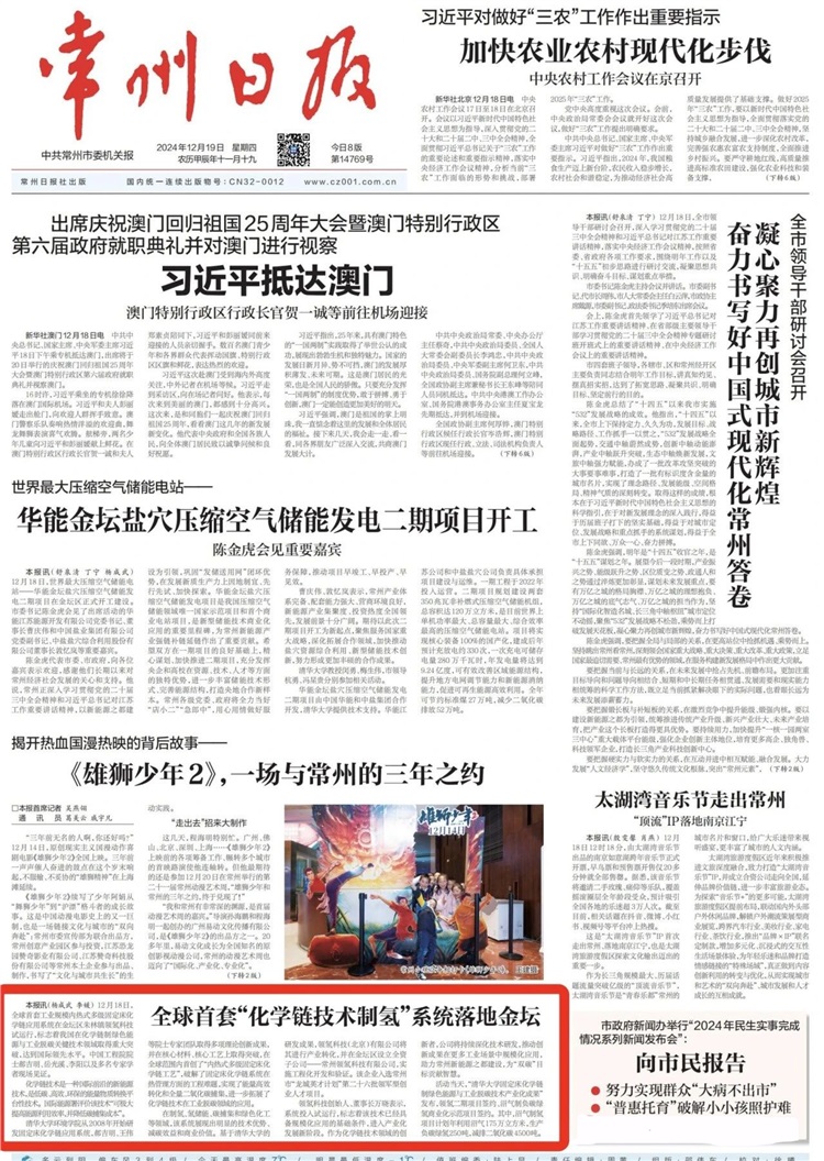 2024年12月18日,全球首套工業(yè)規(guī)模內(nèi)熱式多級(jí)固定床化學(xué)鏈應(yīng)用系統(tǒng)在常州領(lǐng)氫科技試運(yùn)行,這標(biāo)志著我國在化學(xué)鏈制綠色能源與工業(yè)脫碳關(guān)鍵技術(shù)領(lǐng)域取得重大突破,達(dá)到國際領(lǐng)先水平。中國工程院院士郝吉明、岳光溪、李陽以及多名教授專家學(xué)者及知名企業(yè)家現(xiàn)場(chǎng)見證。《常州日?qǐng)?bào)》更是在頭版刊發(fā)要聞《全球首套“化學(xué)鏈制氫”系統(tǒng)落地金壇》,報(bào)道領(lǐng)氫科技全球首套“工業(yè)規(guī)模內(nèi)熱式多級(jí)固定床化學(xué)鏈應(yīng)用系統(tǒng)”啟動(dòng)試運(yùn)行。